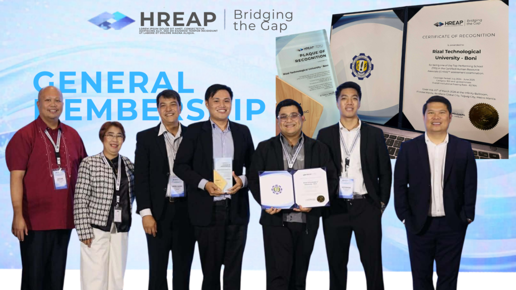 Rizal Technological University – Mandaluyong Campus (RTU-Mandaluyong) has been recognized as one of the Certified Human Resource Associate (CHRA™) Top Performing Schools for 2024–2025 by the Human Resource Educators’ Association of the Philippines (HREAP), Inc., in acknowledgment of the outstanding performance of its graduates in the national CHRA™ assessment examination.