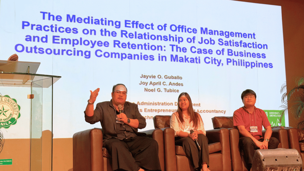 “The Mediating Effects of Office Management Practices on the Relationship Between Job Satisfaction and Employee Retention: The Case of Business Outsourcing Companies in Makati City, Philippines” presented by faculty members from the OA Department, Instr. Joy April Andes, Dr. Jayvie Guballo, and Mr. Noel Tubice provided a nuanced view of how management practices mediate employee outcomes. This research focused on Makati-based BPO companies and explored how office management affects employee morale and loyalty.